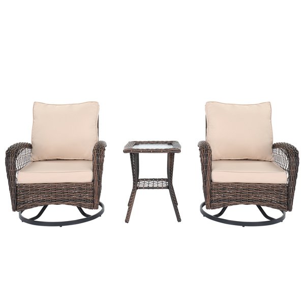 Immerse yourself in the ultimate outdoor relaxation with our 3 Pieces Patio Furniture Set, featuring Outdoor Swivel Gliders Rockers that redefine comfort and style. This exquisite set, designed to enhance your porch, deck, or backyard, includes two swivel rocking chairs and a chic glass-top side table, all adorned in elegant gradient rattan with plush cushions. Crafted for durability and ease, this set promises not only a visually captivating addition to your outdoor space but also a haven for unwinding and enjoying serene moments outdoors. Whether it's a tranquil morning coffee or a leisurely evening chat, this bistro set invites you to savor every moment in the comfort of your own outdoor retreat.