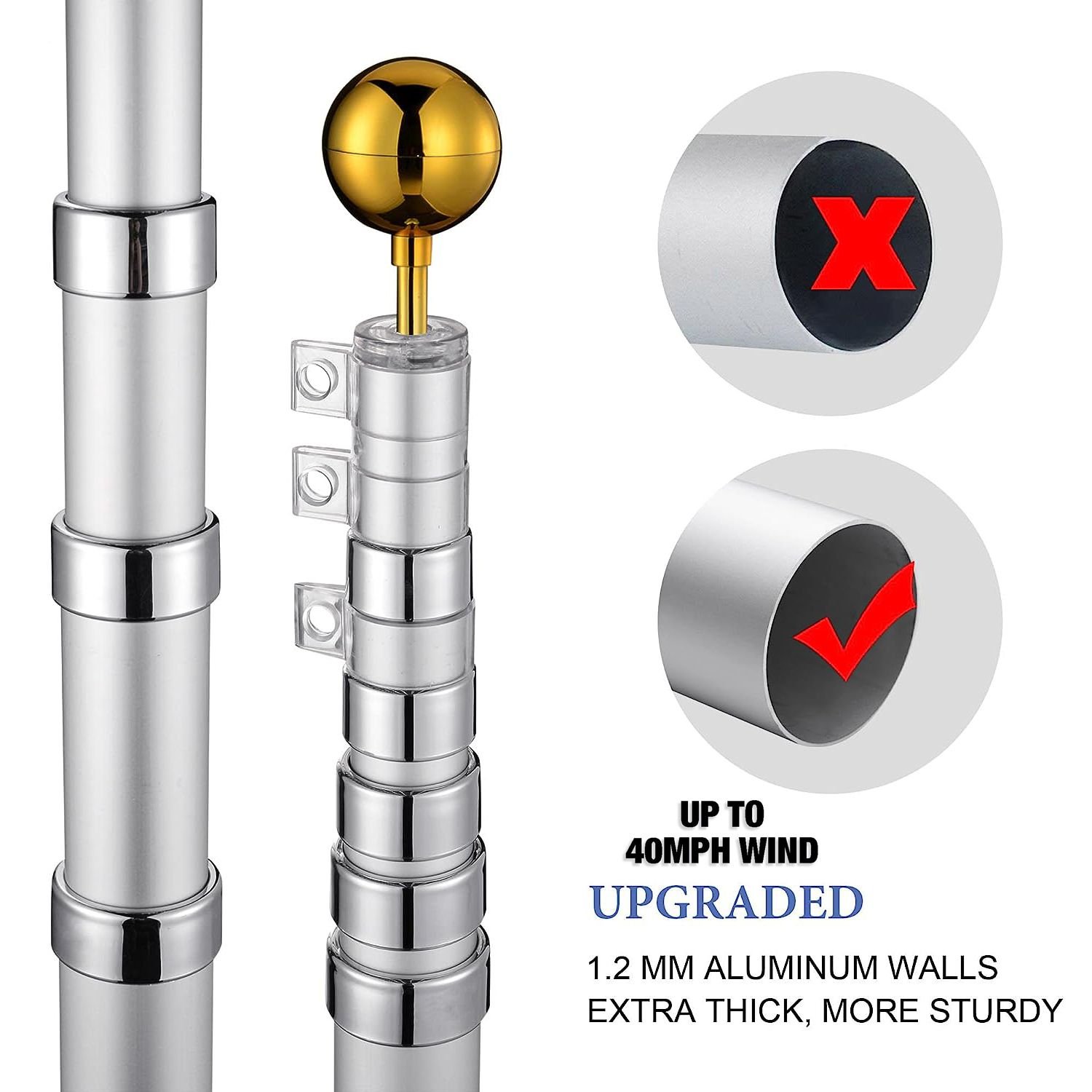 5.All components: 30 foot aluminum telescopic flag 6 knots 1 golden ball 4 aluminum buckles 1 PVC pipe One American flag specification Reinforced 3 corrugated boxes