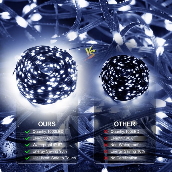 Dimmable Compatible&Energy Saving: Christmas waterproof string light comes with 1000 LED Lights. each lamp light beads have a 15cm spacing,0.5W per LED light bead, The 328ft Christmas lights with 1000 Dimmable LEDs string light can help you to save more electricity. You can get extra-long LED string lights, which are enough to surround and decorate your house.