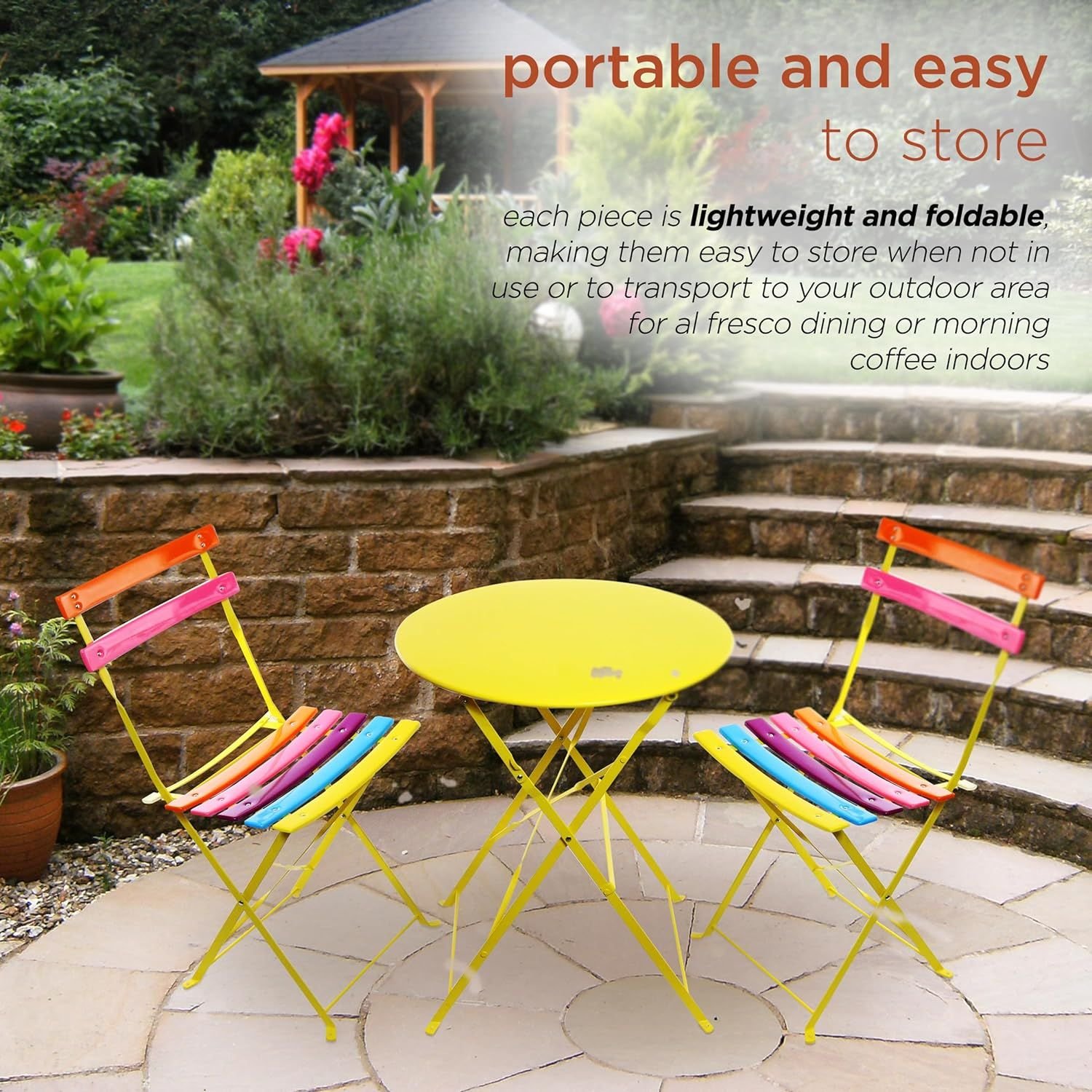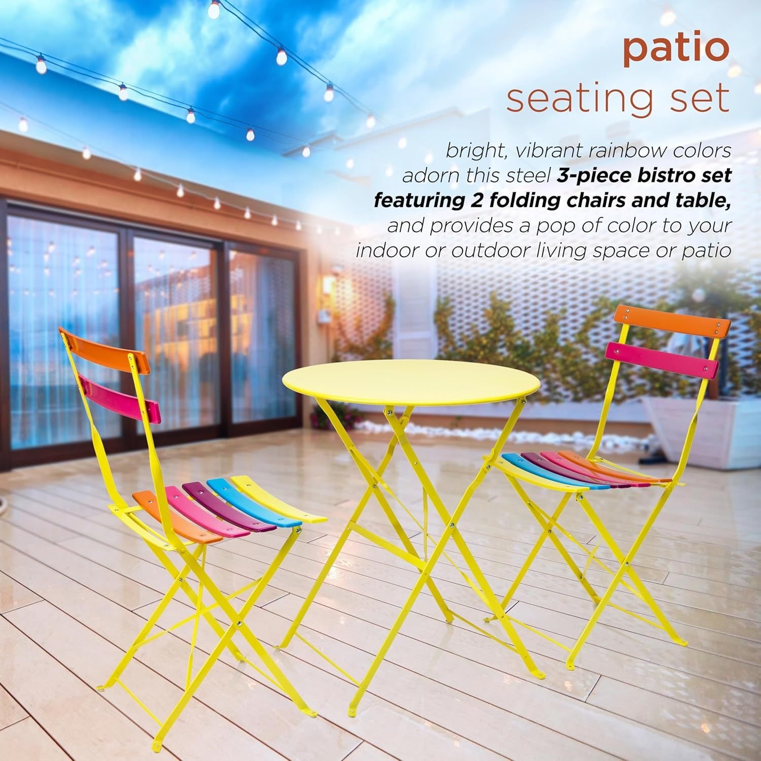 PATIO SEATING SET: Bright, vibrant rainbow colors adorn this steel 3-piece bistro set featuring 2 folding chairs and table, and provides a pop of color to your indoor or outdoor living space or patio