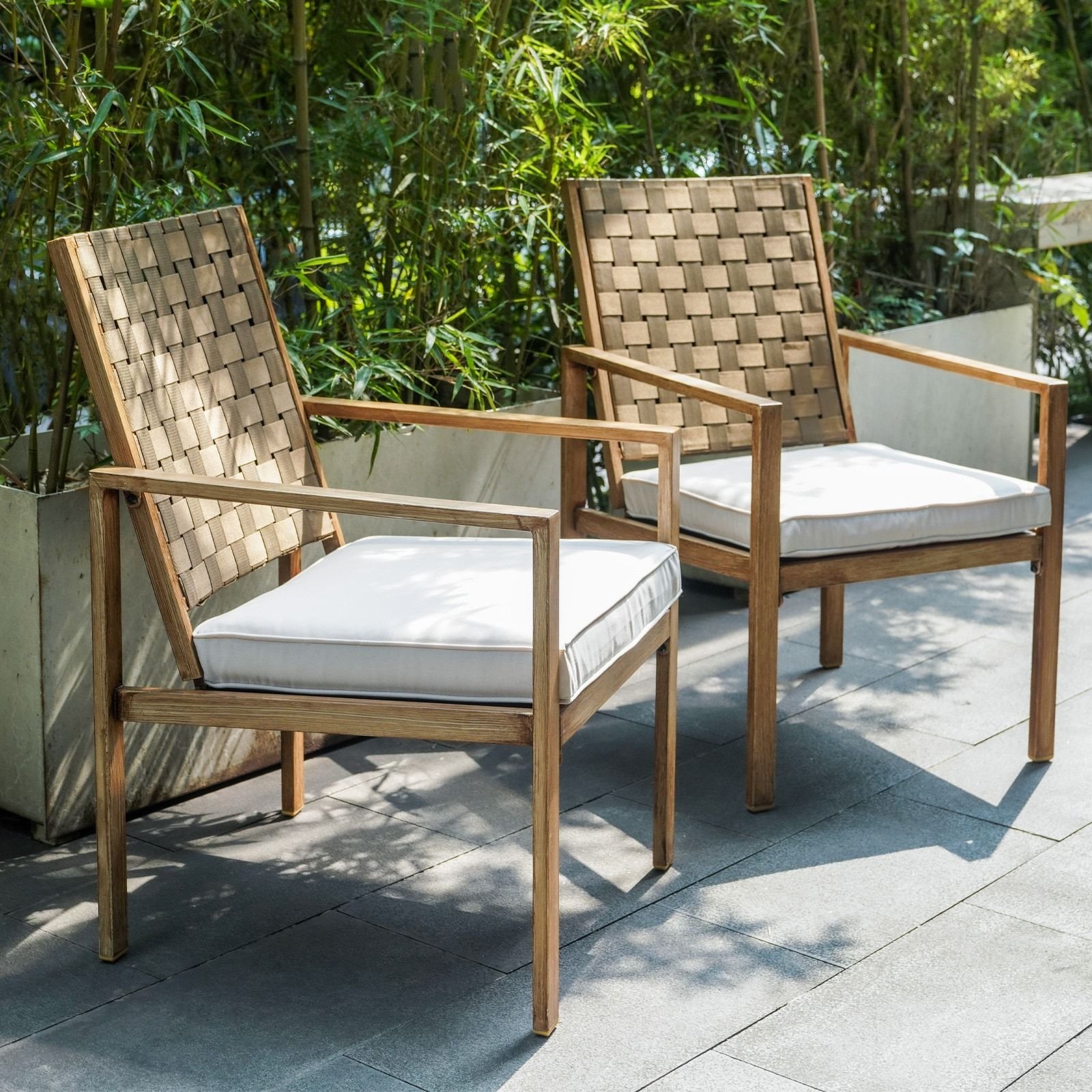 Home > Set of 2 Patio Chairs, Hand-Made Drawstring Outdoor Dining Chairs Waterproof with Cushion, Metal Chairs for Patio, Deck, Garden, Yard - Wood Grain