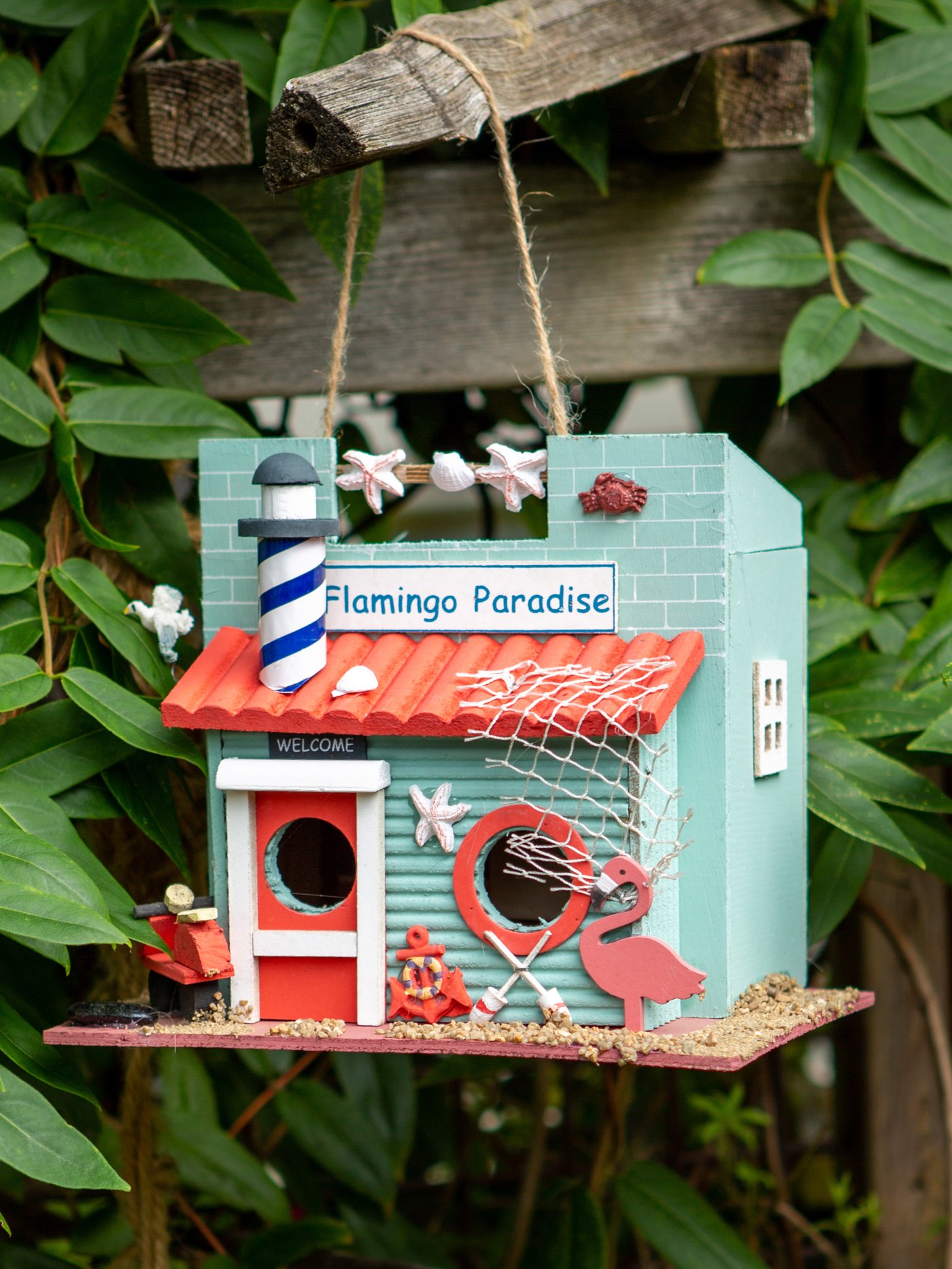 • A fun flamingo hangout by the sea, this novelty birdhouse welcomes your fine feathered friends. Seafoam blue, navy and bright coral hues make this birdhouse a cute conversation piece.
